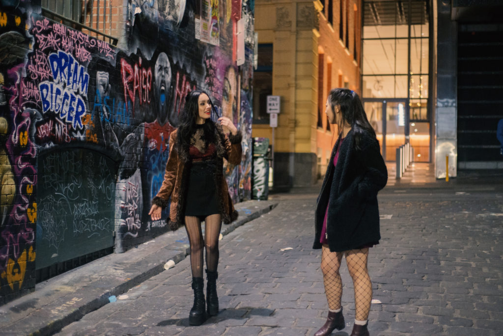 Set for a night of partying Stella’s outfit is a masterclass in layering. Stella wears a black a-line skirt with a sheer top layered over a lacy red bra. She towers over Ingrid in a pair of super high, black, platform boots which she pairs with a sheer black stockings.